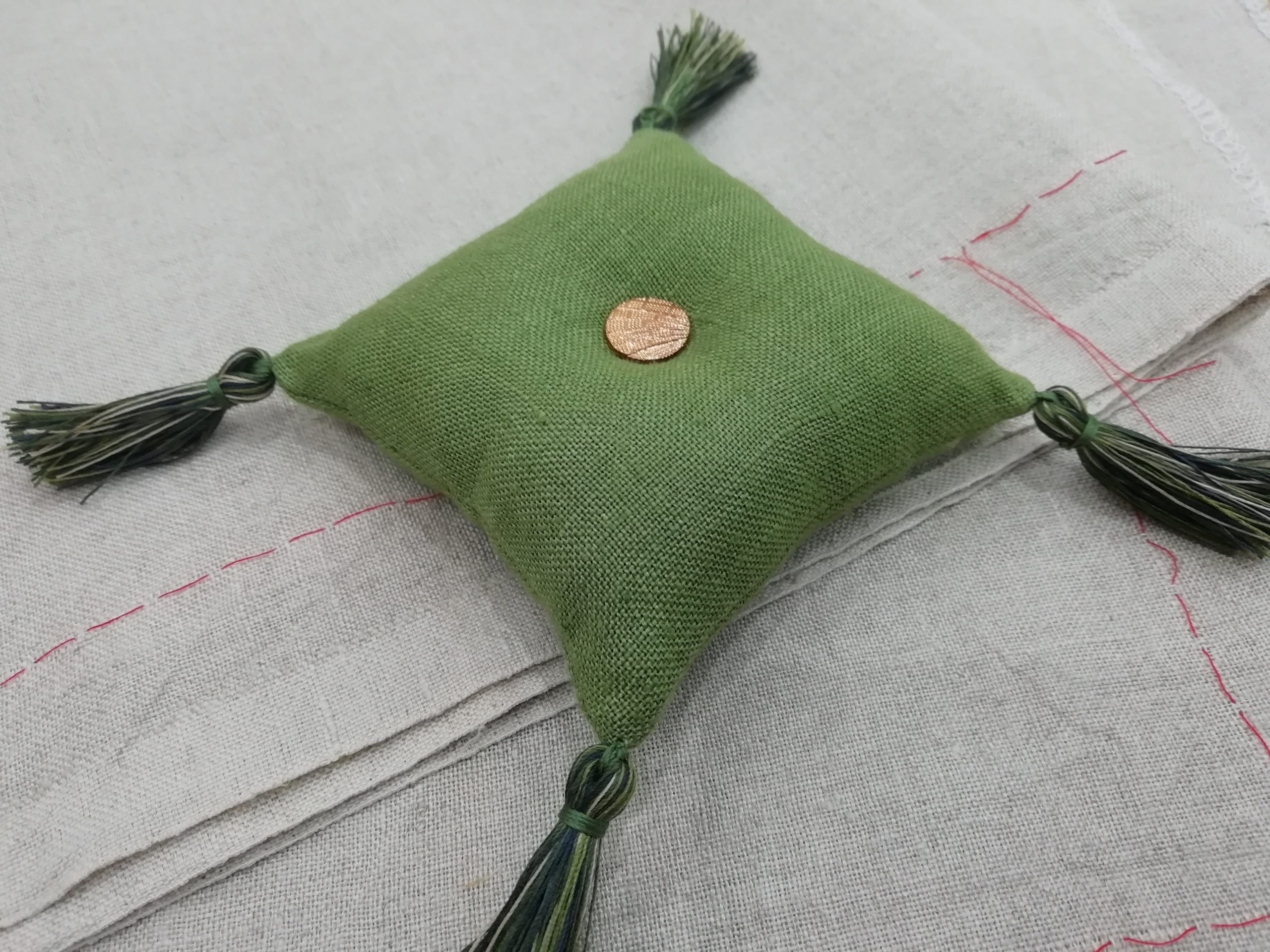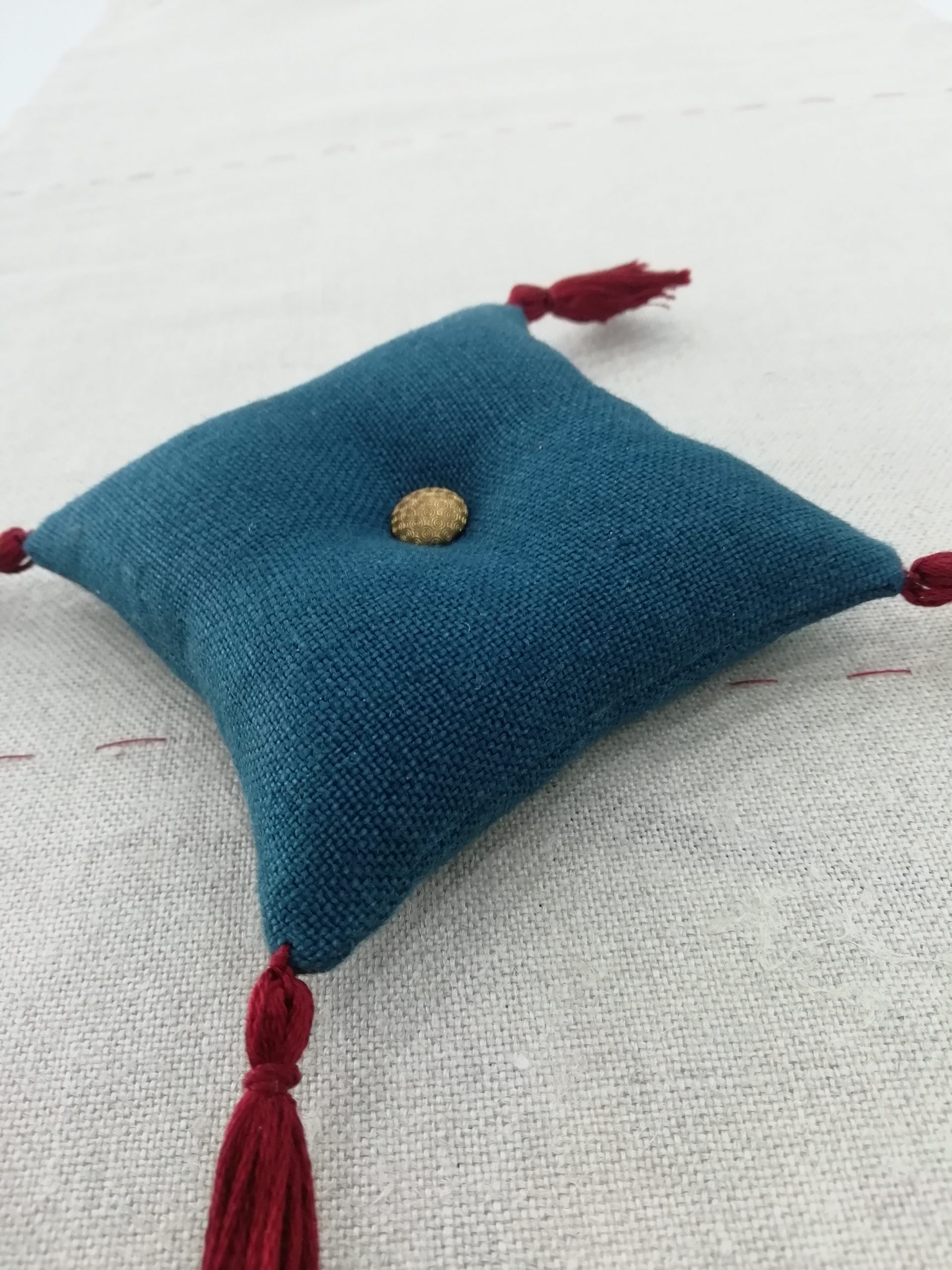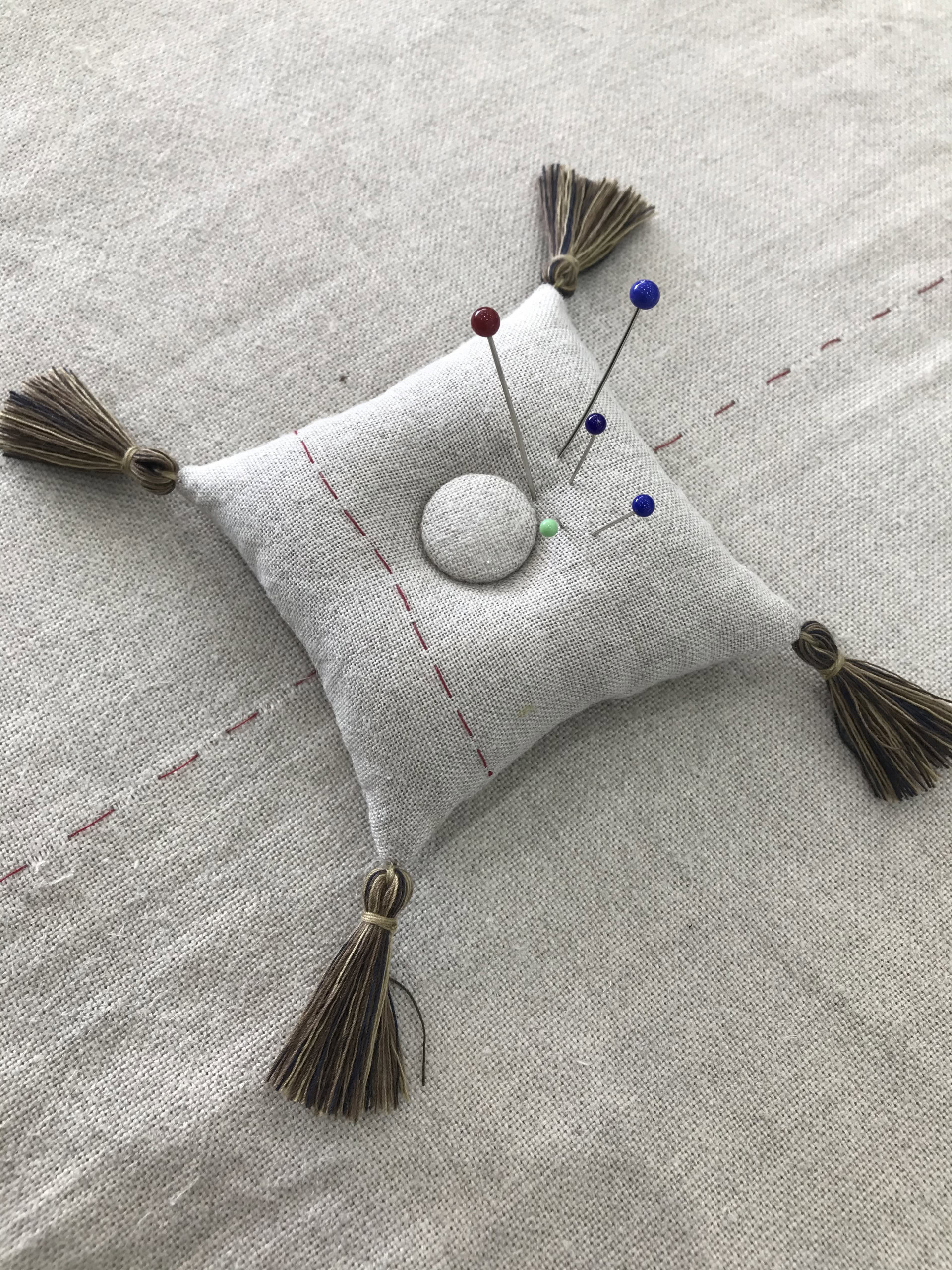 Our beautiful pin cushions are made in-house by our studio team with the remnants of materials and threads used for our conservation projects. Each pin cushion is trimmed with handmade tassels and carefully chosen buttons, and filled with crushed walnut shells to keep your pins nice and sharp.