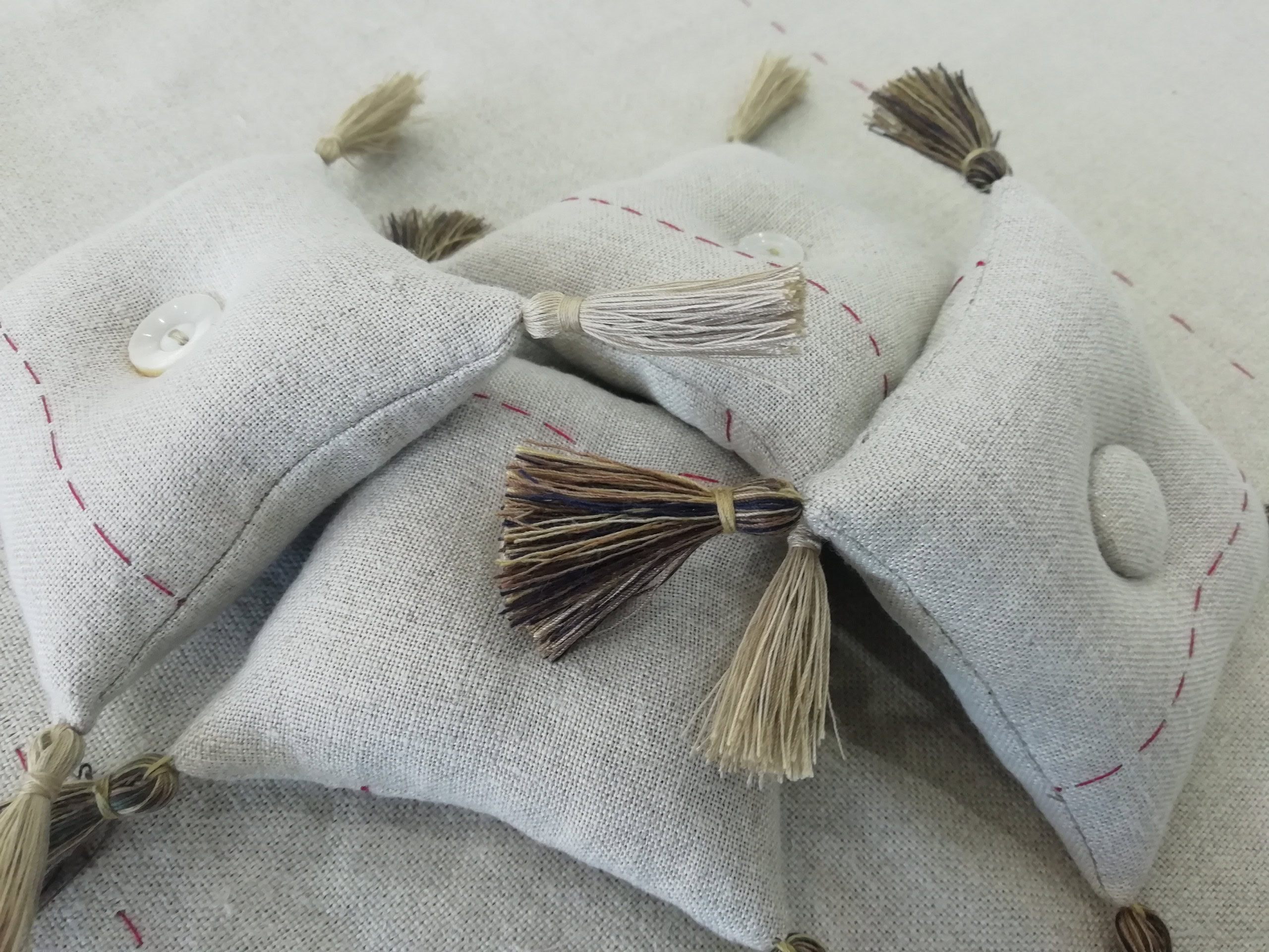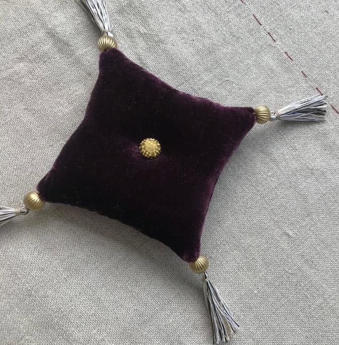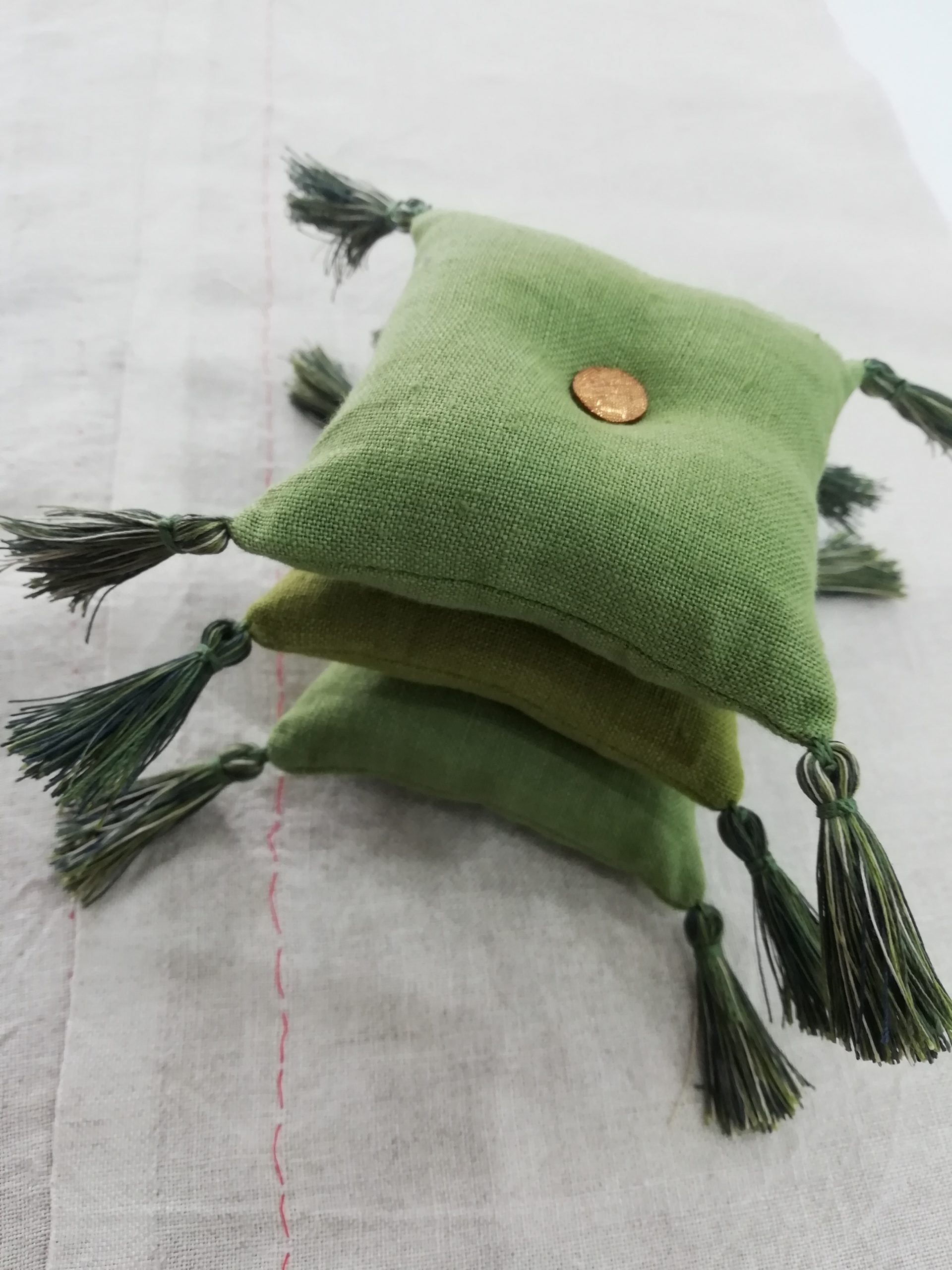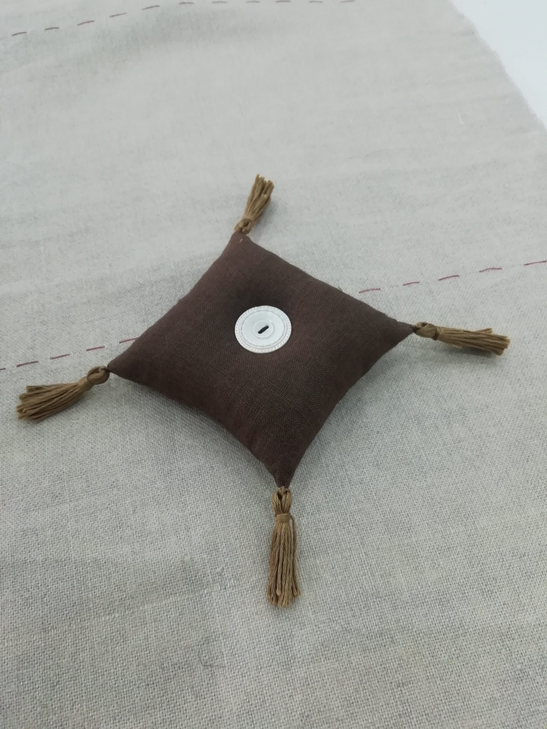 Our beautiful pin cushions are made in-house by our studio team with the remnants of materials and threads used for our conservation projects. Each pin cushion is trimmed with handmade tassels and carefully chosen buttons, and filled with crushed walnut shells to keep your pins nice and sharp.