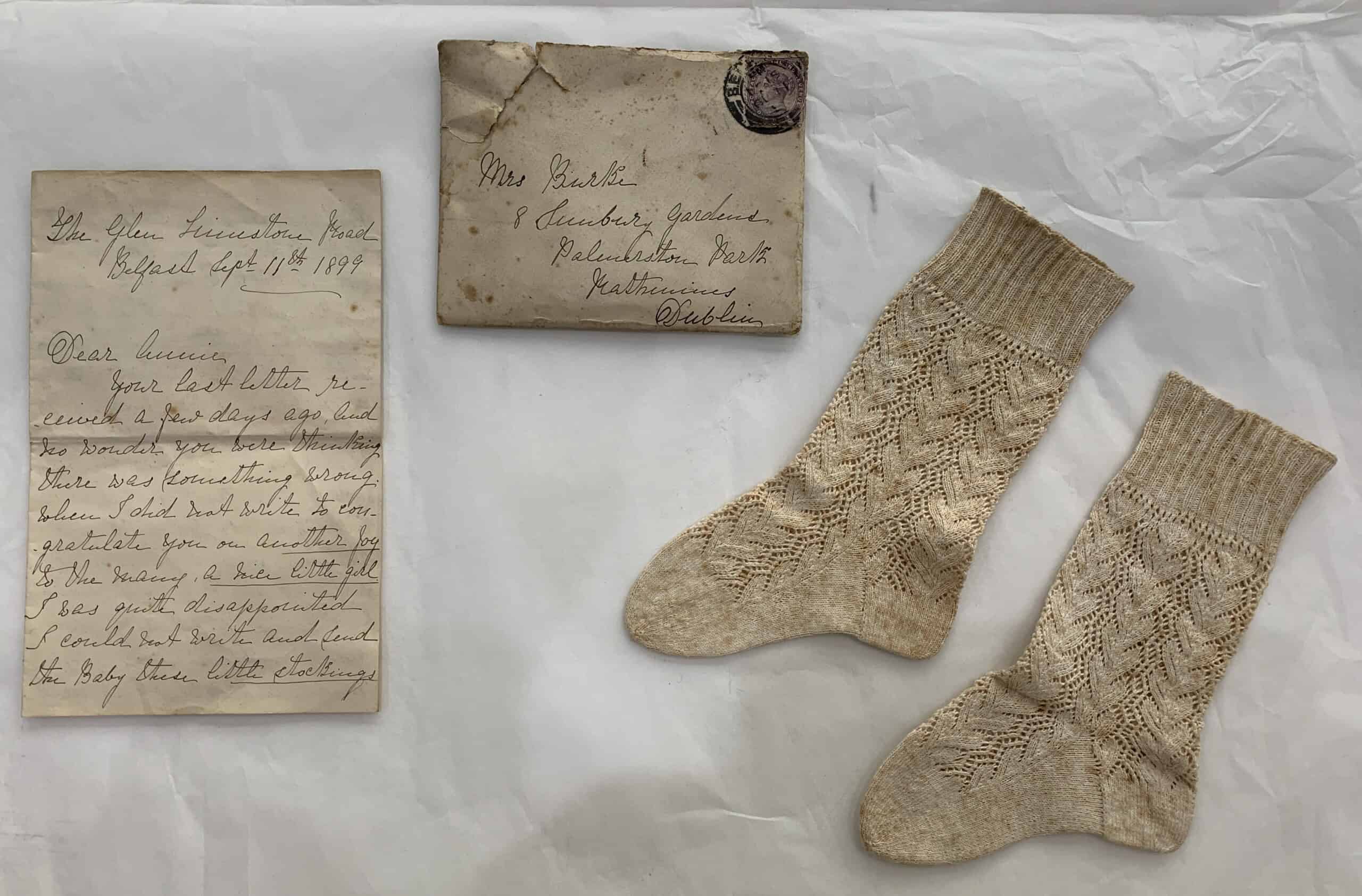 The socks in the Zenzie Tinker Conservation collection are accompanied by a handwritten letter from Jane Osborne in Belfast, dated September 11th 1899 and sent to a friend or relative, Annie, in Dublin upon the birth of her daughter. In the letter, Jane mentions that the socks were originally knitted for her and sent to her own mother – they were only worn once at her baptism in 1847, already making them a good 52 years old when they were sent to Annie.